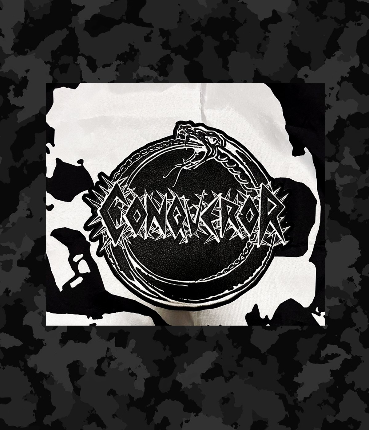 Conqueror / Shaped Logo Ouroboros Back Patch / LARGE 12 INCH BY 11 INCH / Faux Leather Embroidered